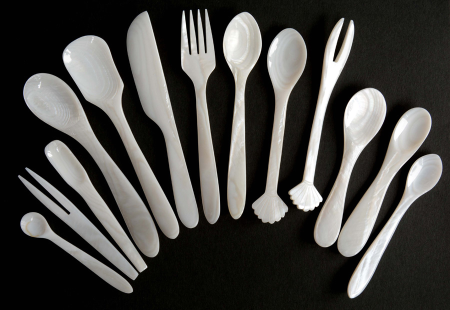 左:白貝スプーン・フォーク・ナイフ5点
